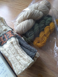 Each kit will have enough wool to knit a pair of medium/large fingerless mitts and will consist of one ball of natural wool (220 yards) and two smaller balls (35 yards each) of naturally dyed wool. The colours will vary per kit as to showcase the wonderful palette that is Huron County.
